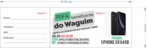 RIFA Simples – Tamanho: 16,5×5,4cm, impressão colorida 1 lado, papel ap 75g – Acabamento: Grampo, Picote e Numeração